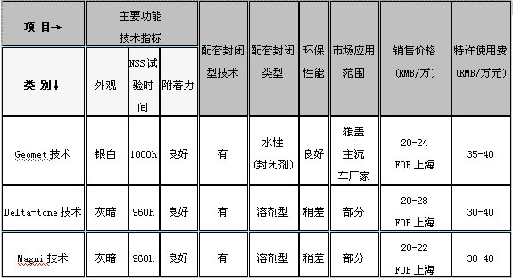 近年來,該涂料技術(shù)尤其在汽車行業(yè)得到迅速的認(rèn)證和推廣應(yīng)用,許多國際知名汽車公司如福特(Ford)、通用、寶馬(Bwm)、雷諾、菲亞特(Fiat)、沃爾沃(Volvo)、戴姆勒?克萊斯勒等都制定了零配件Geomet涂裝標(biāo)準(zhǔn)(見附錄),要求必須使用Geomet涂料涂裝技術(shù)。 國外同類技術(shù)的發(fā)展概況: