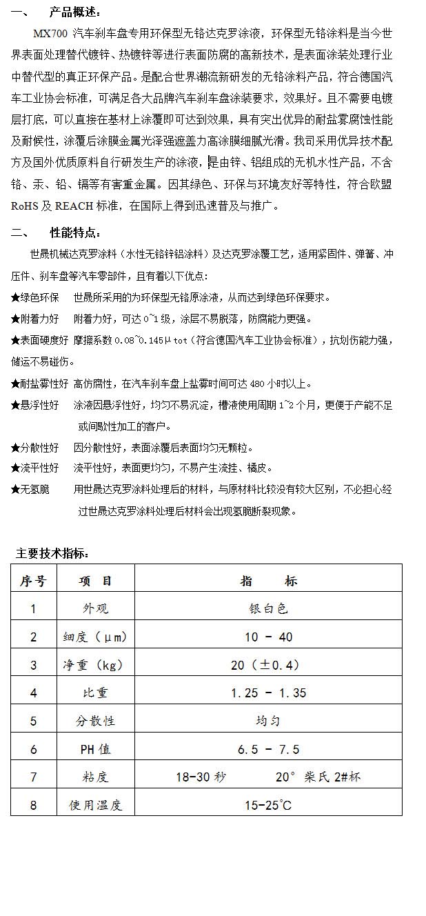 產(chǎn)品名稱:MX700汽車剎車盤專用環(huán)保型無鉻達克羅涂液